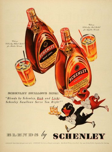 This is an original 1940 color print ad for Black Label and Red Label Schenley Blended Whiskey by Schenley Distillers Corporation of New York City, New York.1940 Ad Black Red Label Schenley Distillers Whiskey - Original Print Ad Specifications
